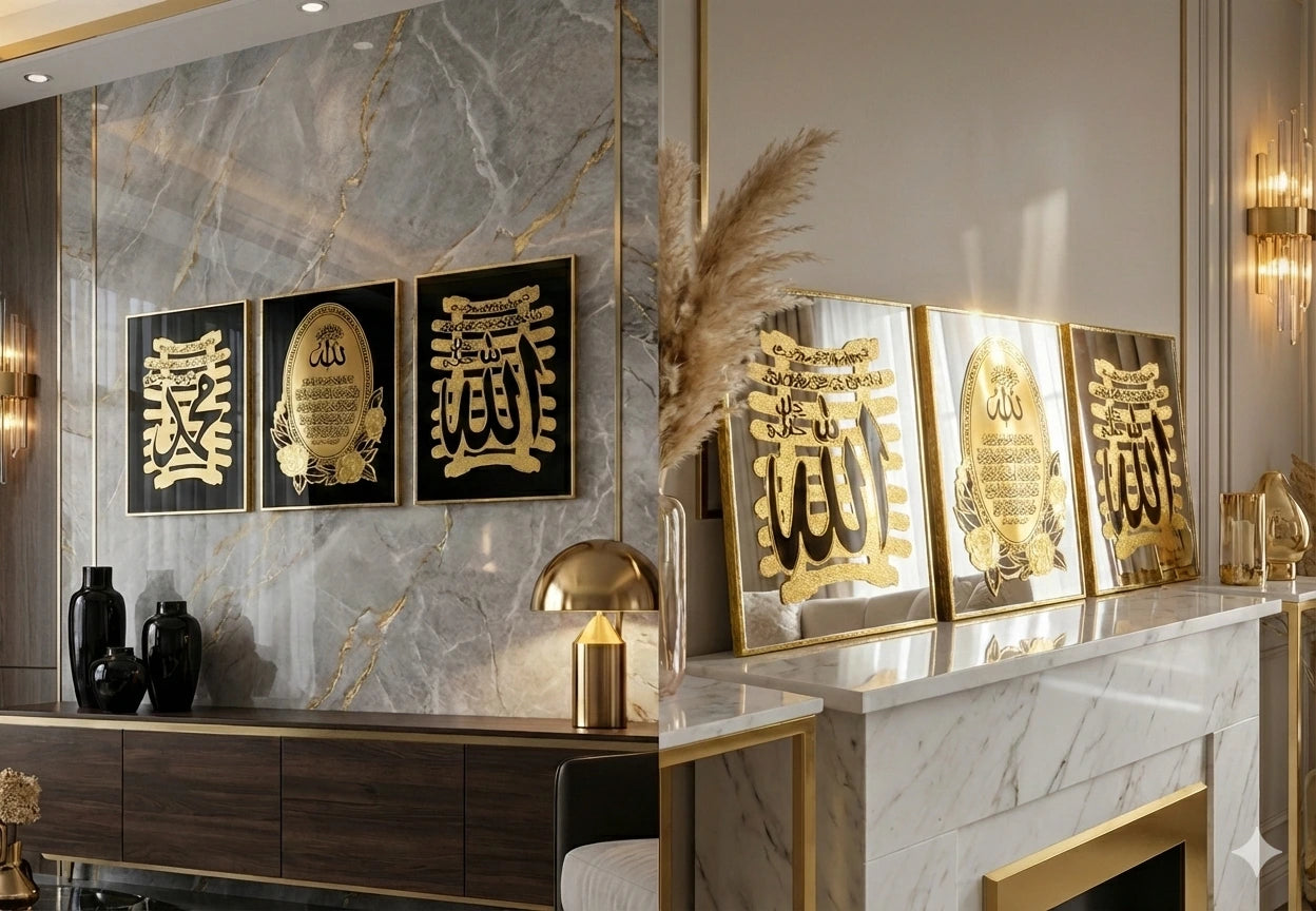تصميم فاخر: خط عربي متقن وتفاصيل مذهبة تليق بالبيوت العصرية.